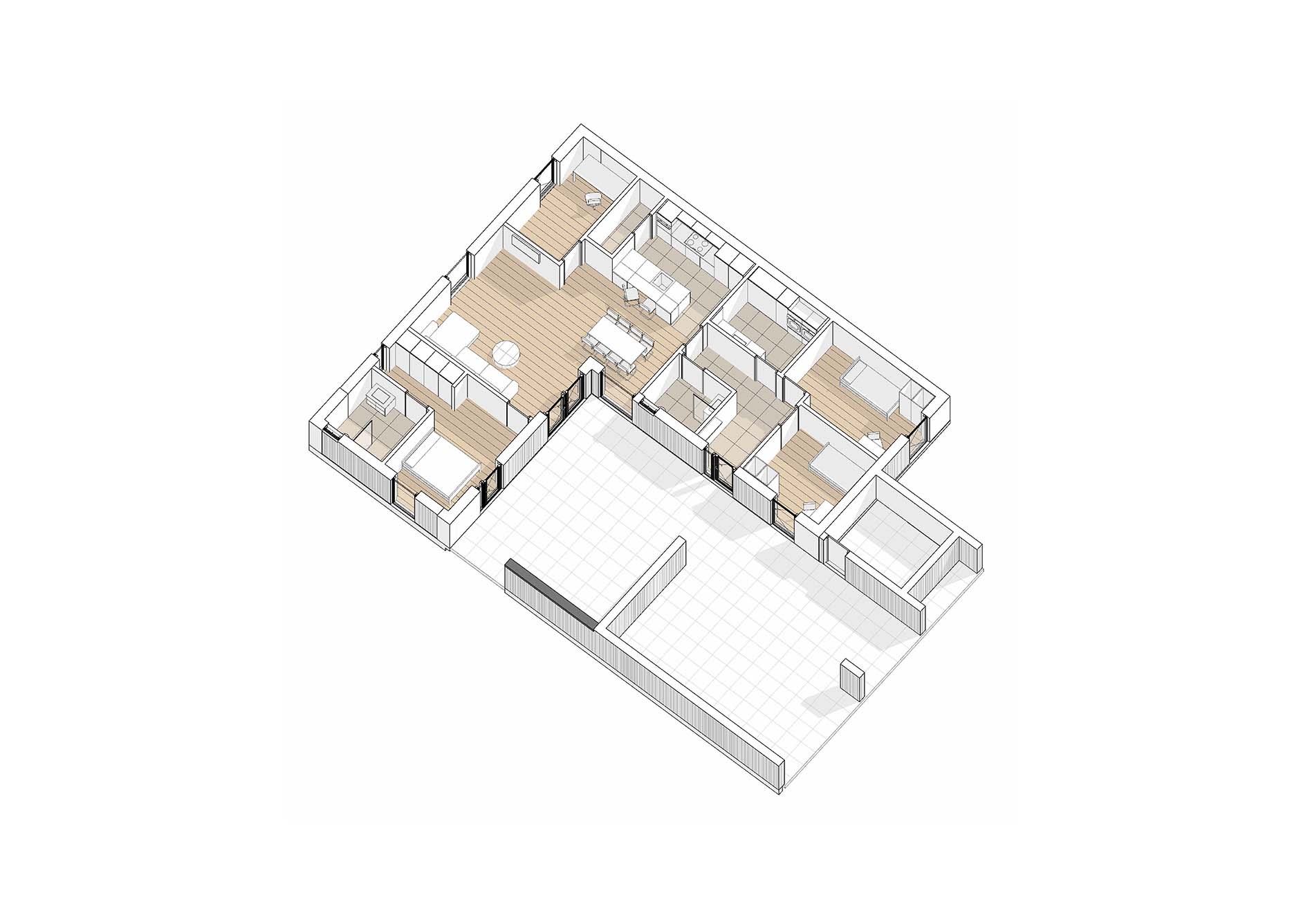 Gårdhavehuset henvender sig især til børnefamilier, da planløsningen gør det nemt at indrette sig med både en voksen- og en børneafdeling, hvilket gør det ideelt for både store og små familier. Boligen har tre værelser, et soveværelse med walk-through og eget badeværelse. Derudover findes endnu et dejligt badeværelse samt et godt bryggers. En særlig detalje er det praktiske viktualierrum i forbindelse med køkkenet. Indretningen er designet med fokus på lysindfald, særligt i det lyse og åbne opholdsrum.