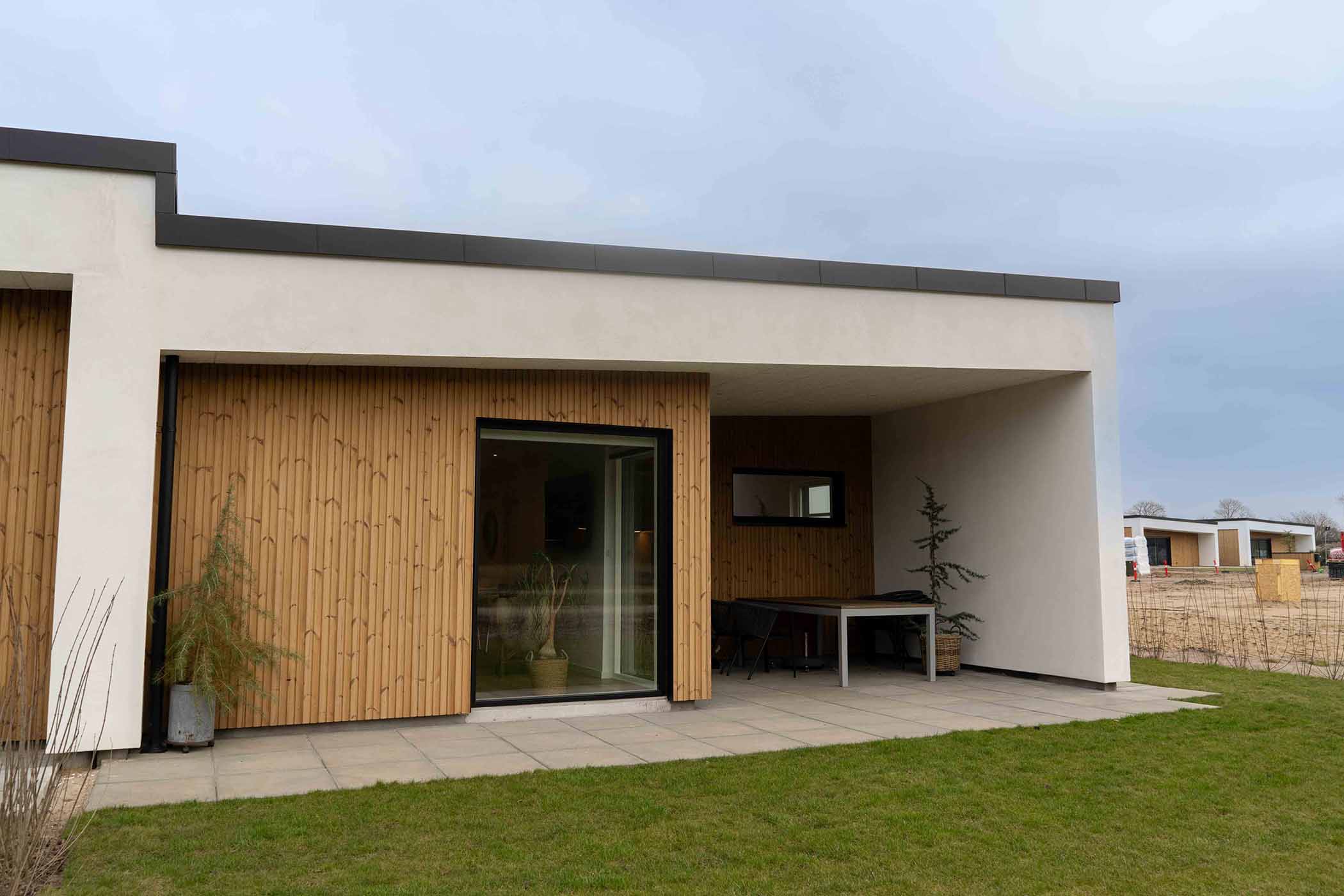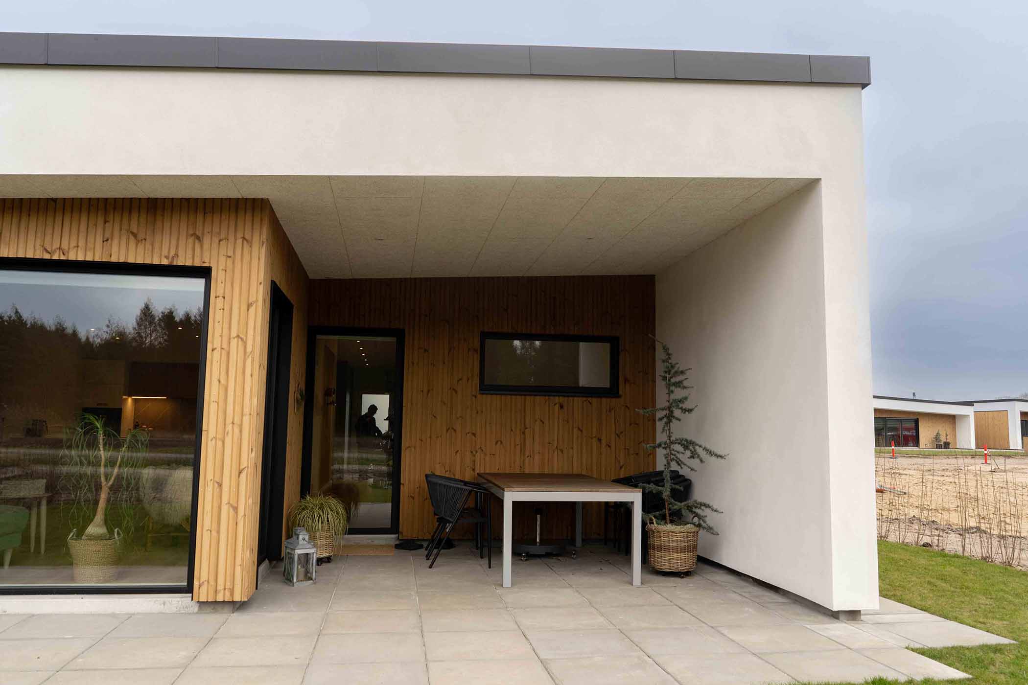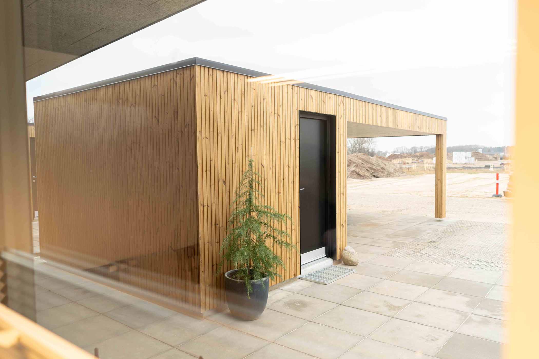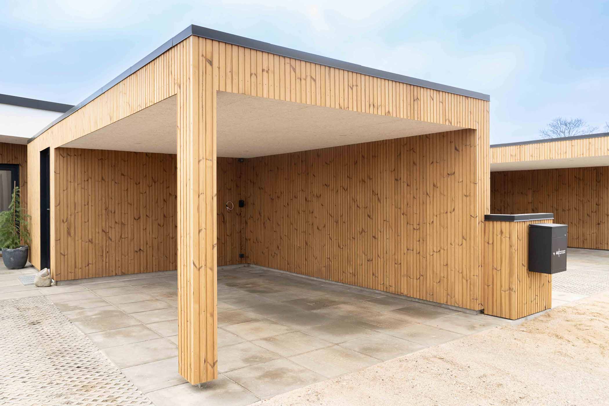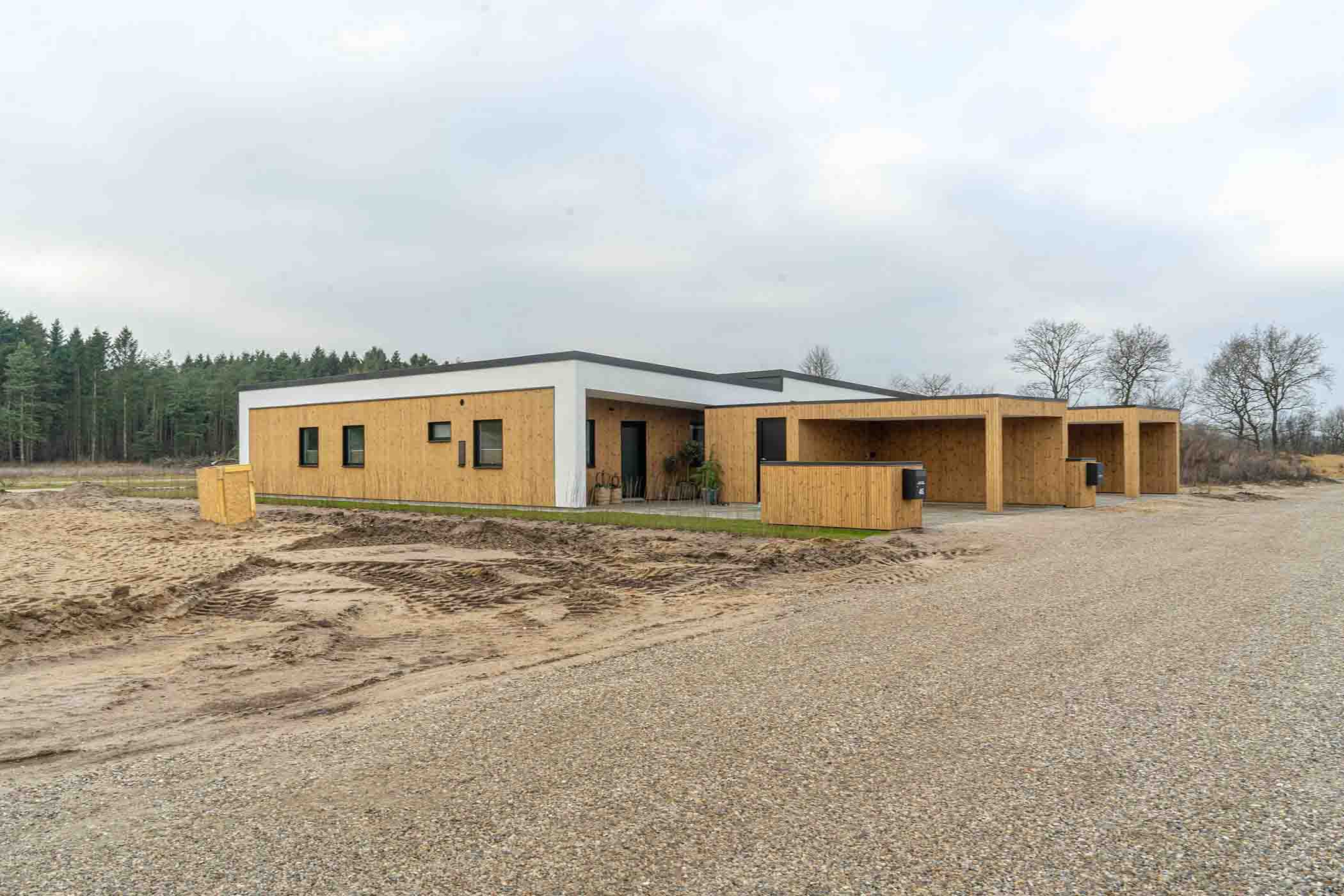 Boligen opføres med en praktisk carport, der beskytter bilen mod vejrets påvirkninger, samt et separat skur, ideelt til opbevaring af haveredskaber, cykler eller andre nødvendigheder. Den nemme grund er designet med fokus på minimal vedligeholdelse, så du kan bruge din tid på det, der virkelig betyder noget, i stedet for at bekymre dig om havearbejde. Den store, delvist overdækkede terrasse giver en perfekt ramme for udendørs ophold, hvor du kan nyde naturen og det gode vejr, uanset årstid. Dette skaber et ideelt udemiljø for afslapning og sociale stunder.
