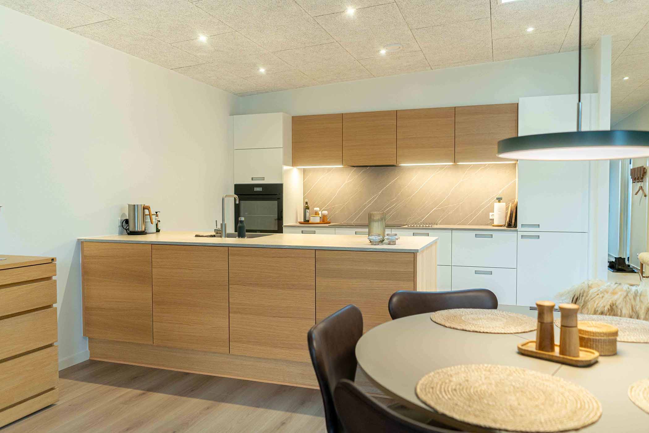 Der monteres elementer i køkken, badeværelser og bryggers fra Svane Køkkenet og hårde hvidevarer i køkkenet er fra AEG.