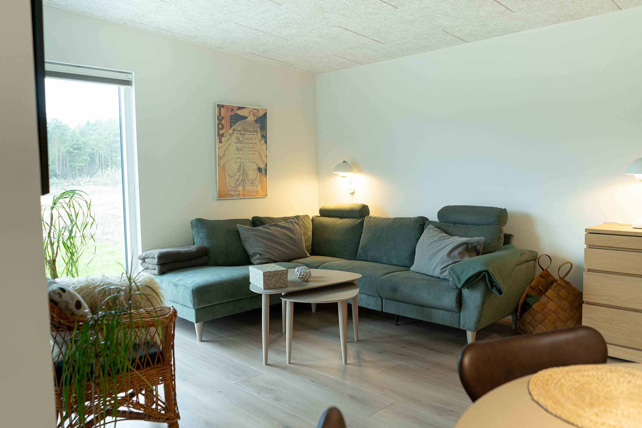 Indretningen er designet med fokus på lysindfald, særligt i det lyse og åbne opholdsrum. Herfra er der direkte adgang til en stor, delvist overdækket terrasse.