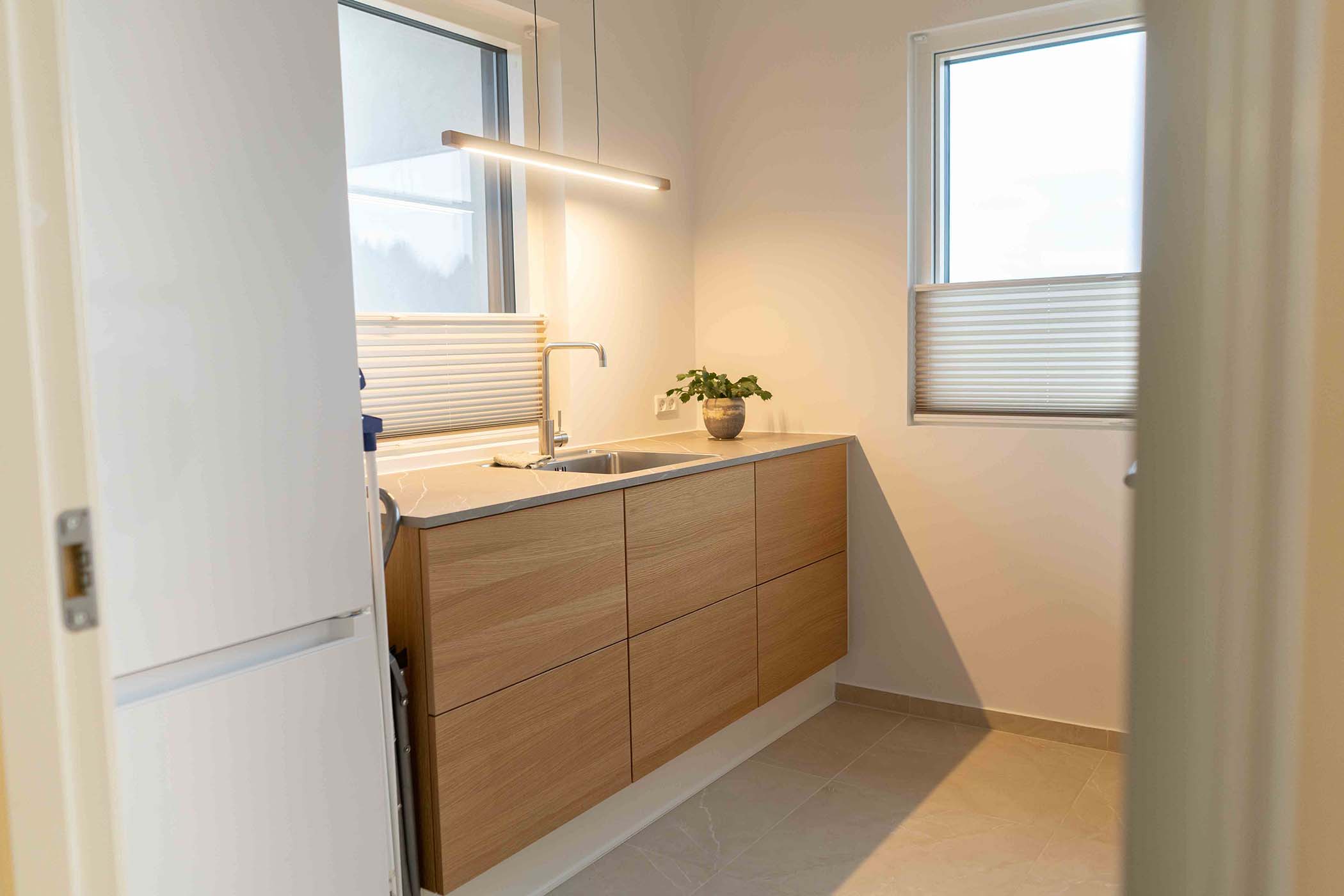 Du får mulighed for at tilpasse hjemmet præcist efter dine ønsker og behov. Du kan vælge mellem forskellige stilfulde køkkenelementer, der passer til husets moderne og minimalistiske design. Uanset om du foretrækker et klassisk, tidløst look eller en mere moderne, funktionel løsning, er der flere muligheder for at skabe et køkken, der passer perfekt til din livsstil.