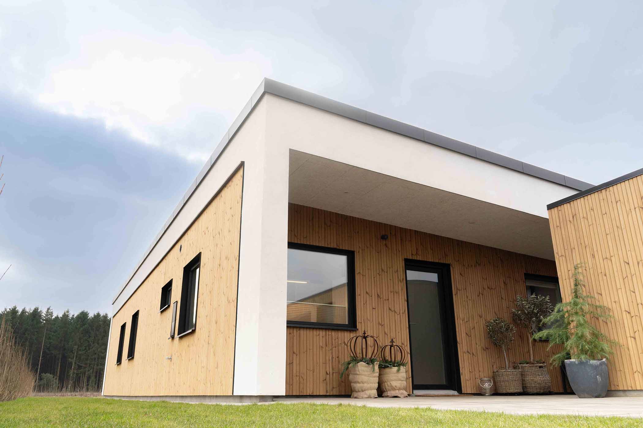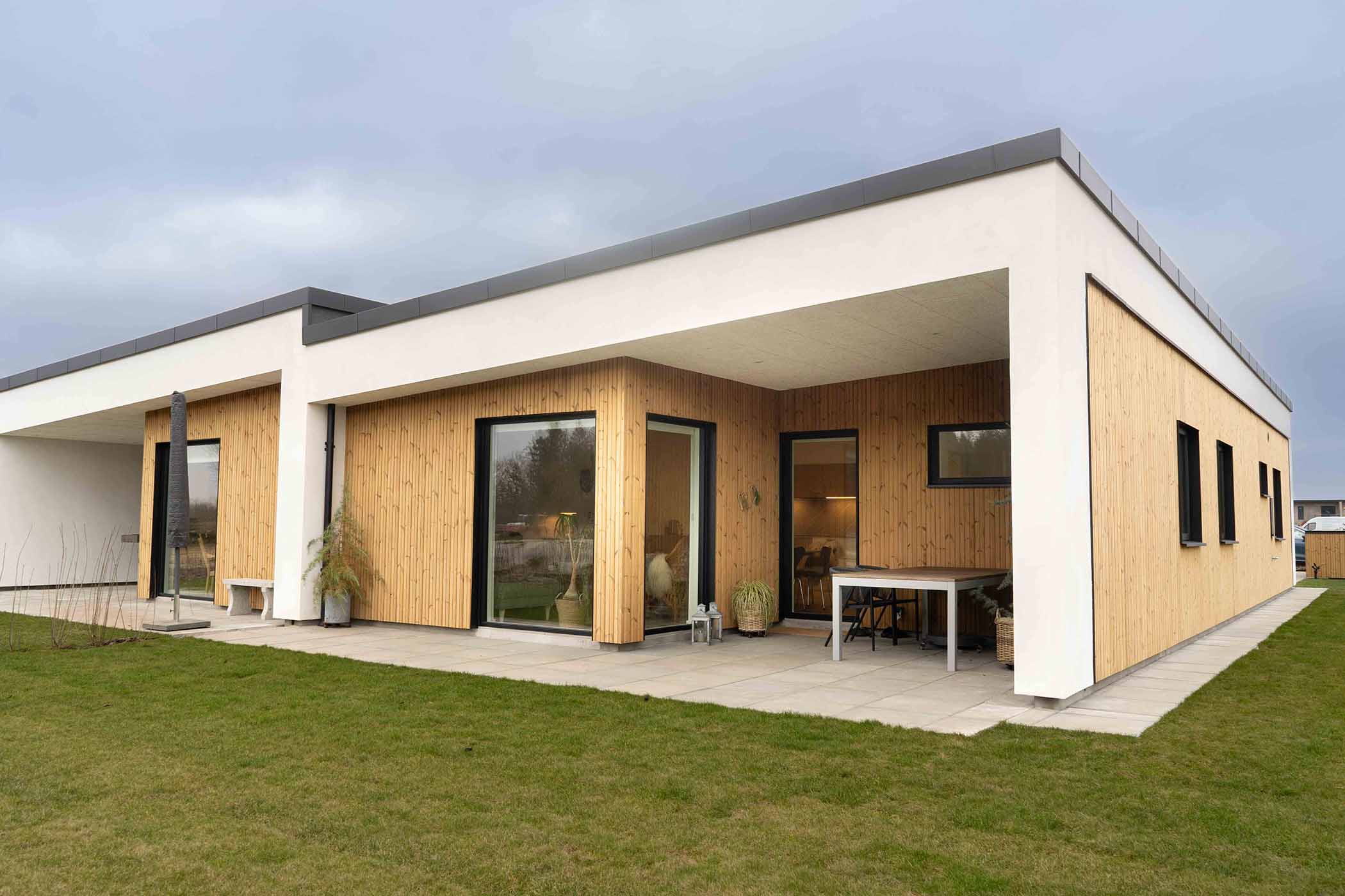 Hus med ensidig taghældning på 116 kvm: Alrune 1-plans dobbelthus er både rummelige og moderne, opført i en enkel og minimalistisk stil, hvor den ensidige taghældning er en markant og iøjnefaldende detalje.