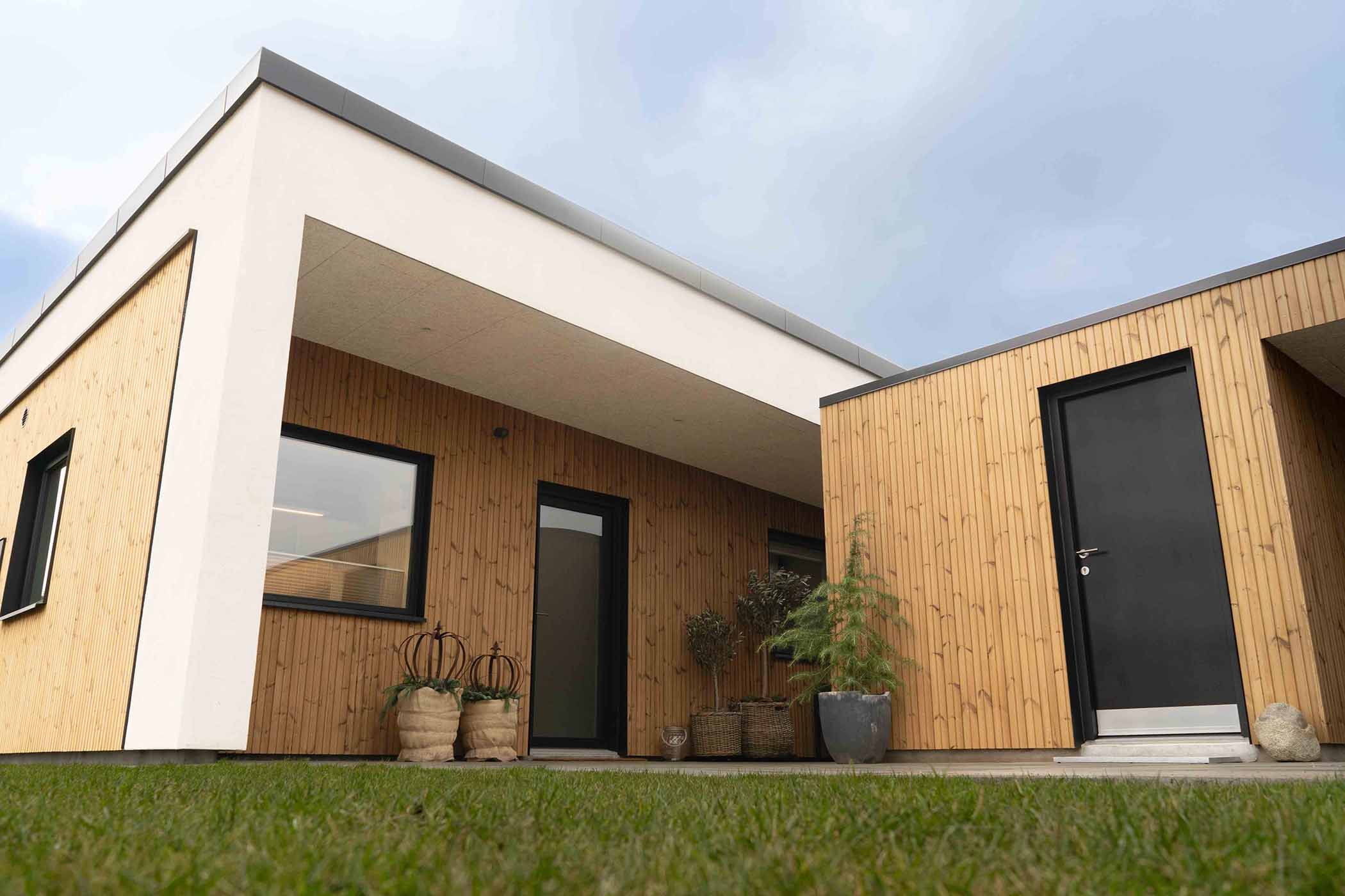 Hus med ensidig taghældning på 116 kvm: Alrune 1-plans dobbelthus er både rummelige og moderne, opført i en enkel og minimalistisk stil, hvor den ensidige taghældning er en markant og iøjnefaldende detalje.